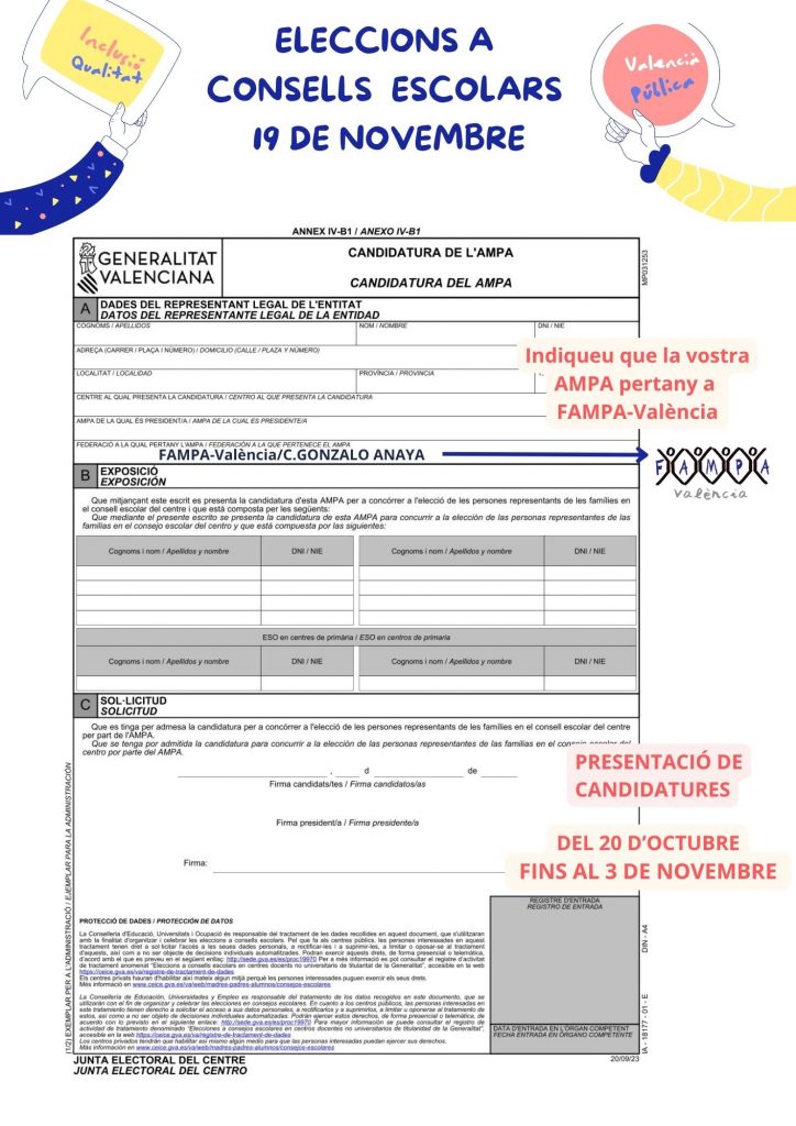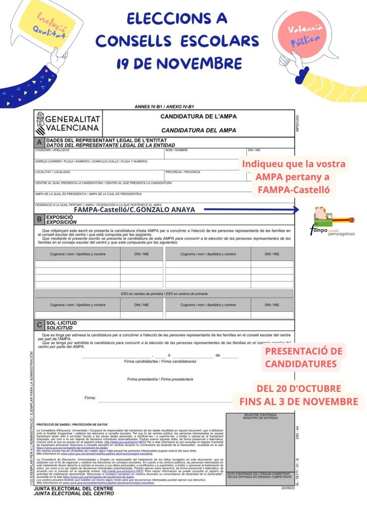 Ara que ja teniu clar que voleu ser candidates i candidats de l’AMPA a les eleccions als consells escolars de centre, vos compartim els materials de la campanya de les eleccions a consells escolars de centre (calendari general, full oficial de presentació de candidatura de l’AMPA, cartell general i cartell per personalitzar amb les candidates i els candidats), tot per donar-vos suport amb la campanya del 23N de FAMPA Castelló Penyagolosa, FAMPA-València i FAMPA Enric Valor Alacant unides a la Confederació d’AMPA Gonzalo Anaya de la Comunitat Valenciana
